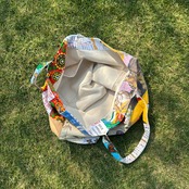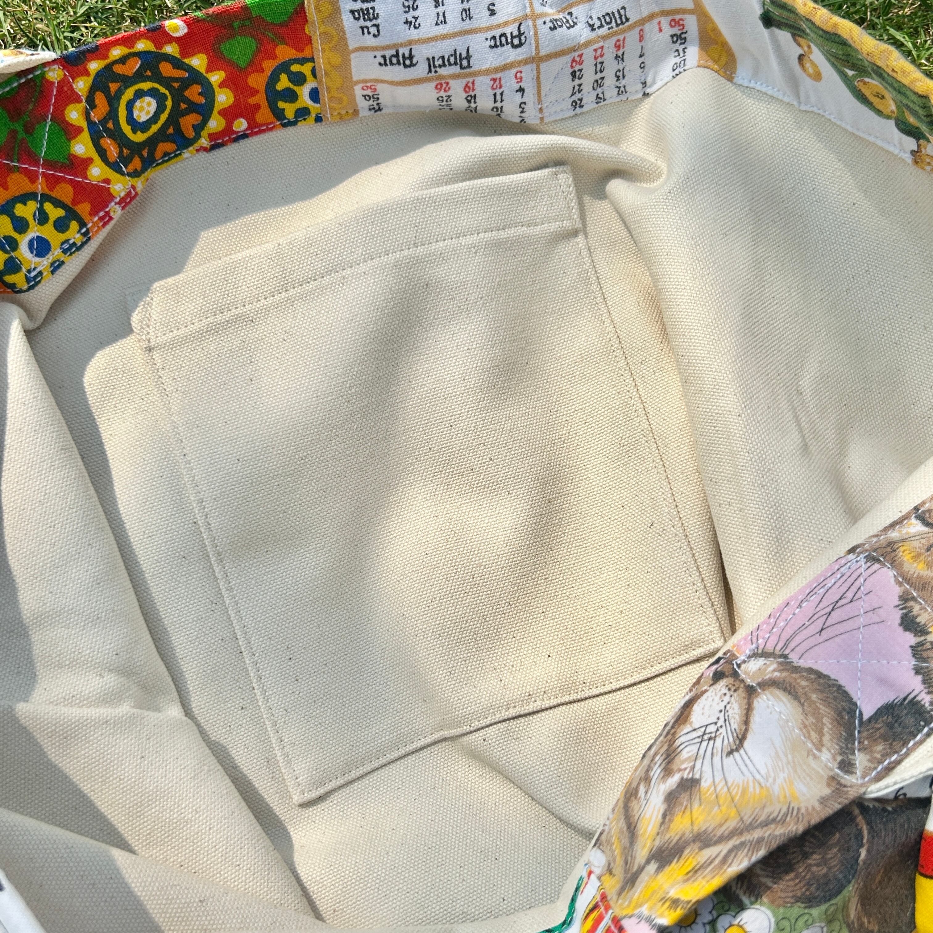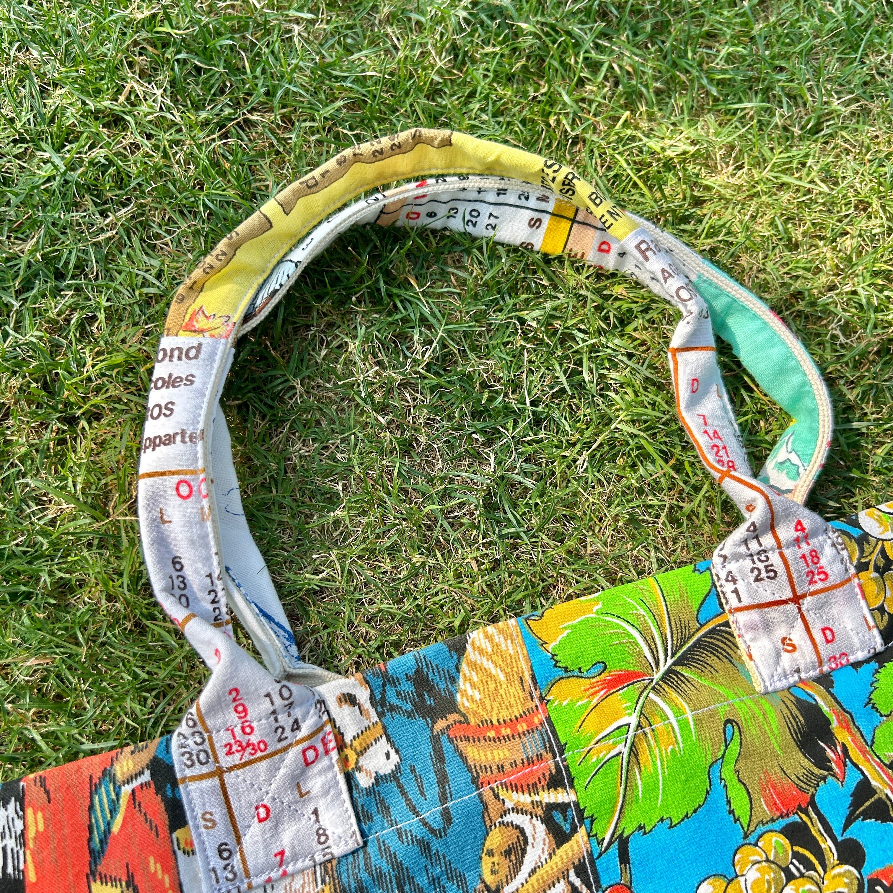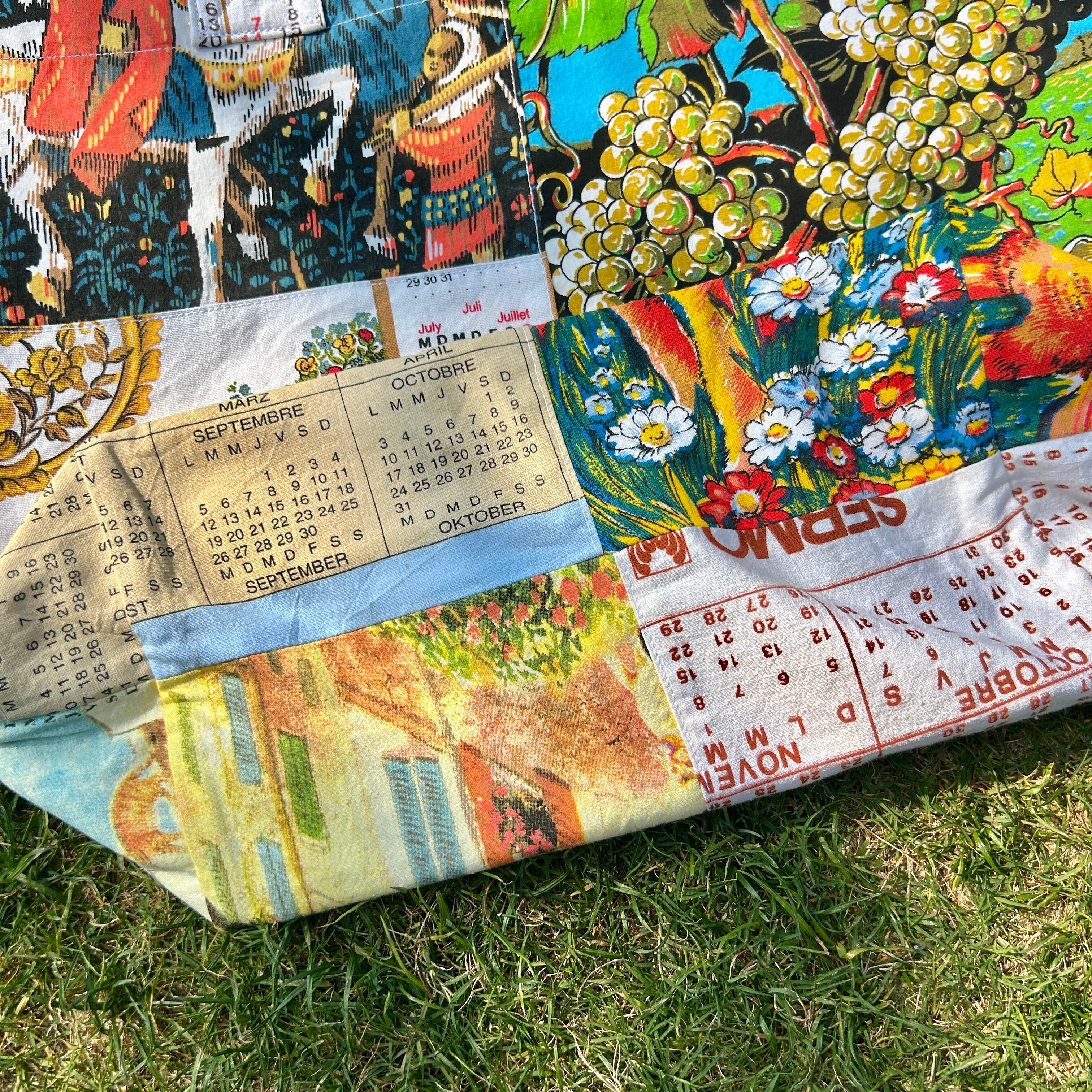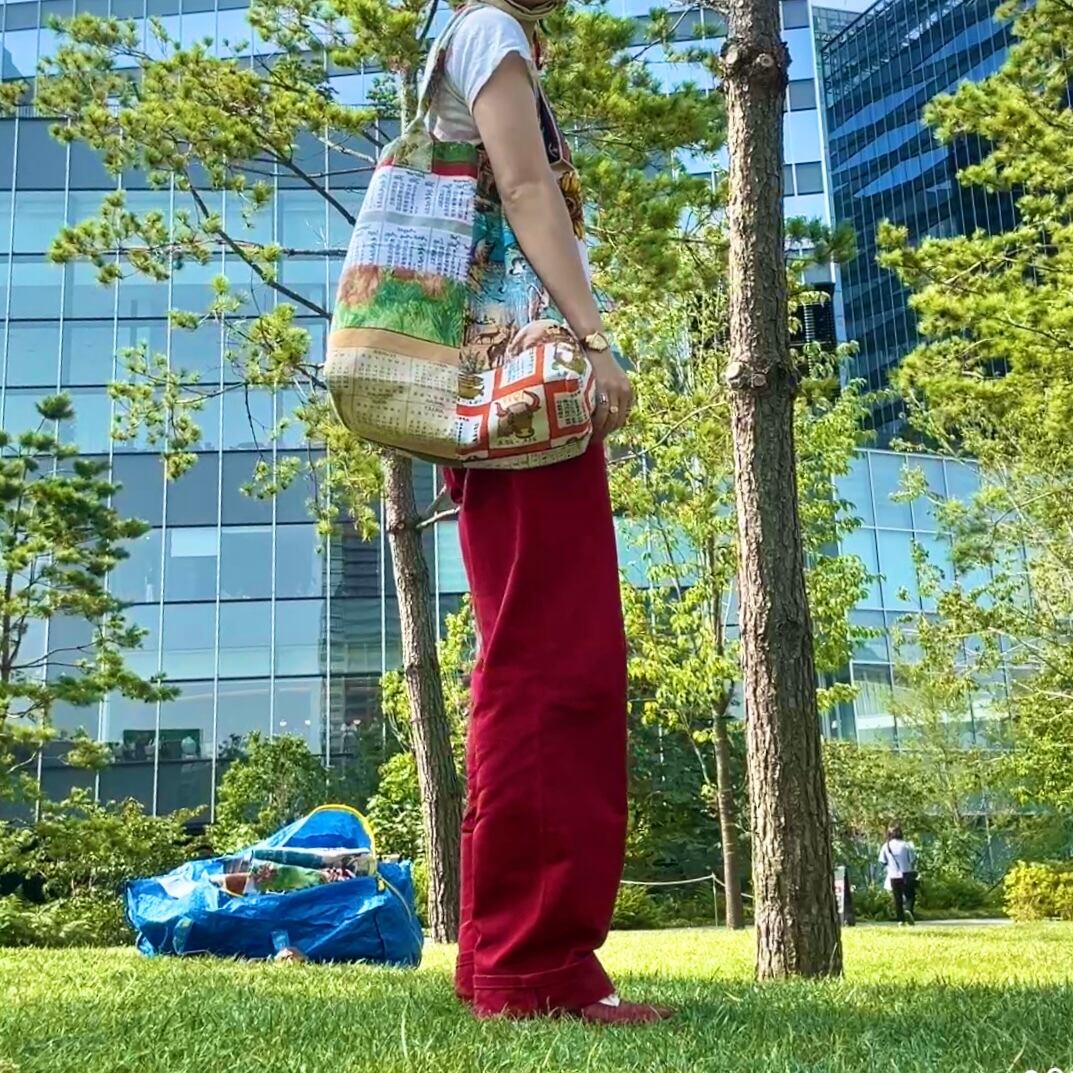 ヴィンテージのカレンダーやキッチンクロスをリメイクして作ったビッグトートバッグです。広めなマチと肩にかけれる持ち手は普段使いにぴったりです。