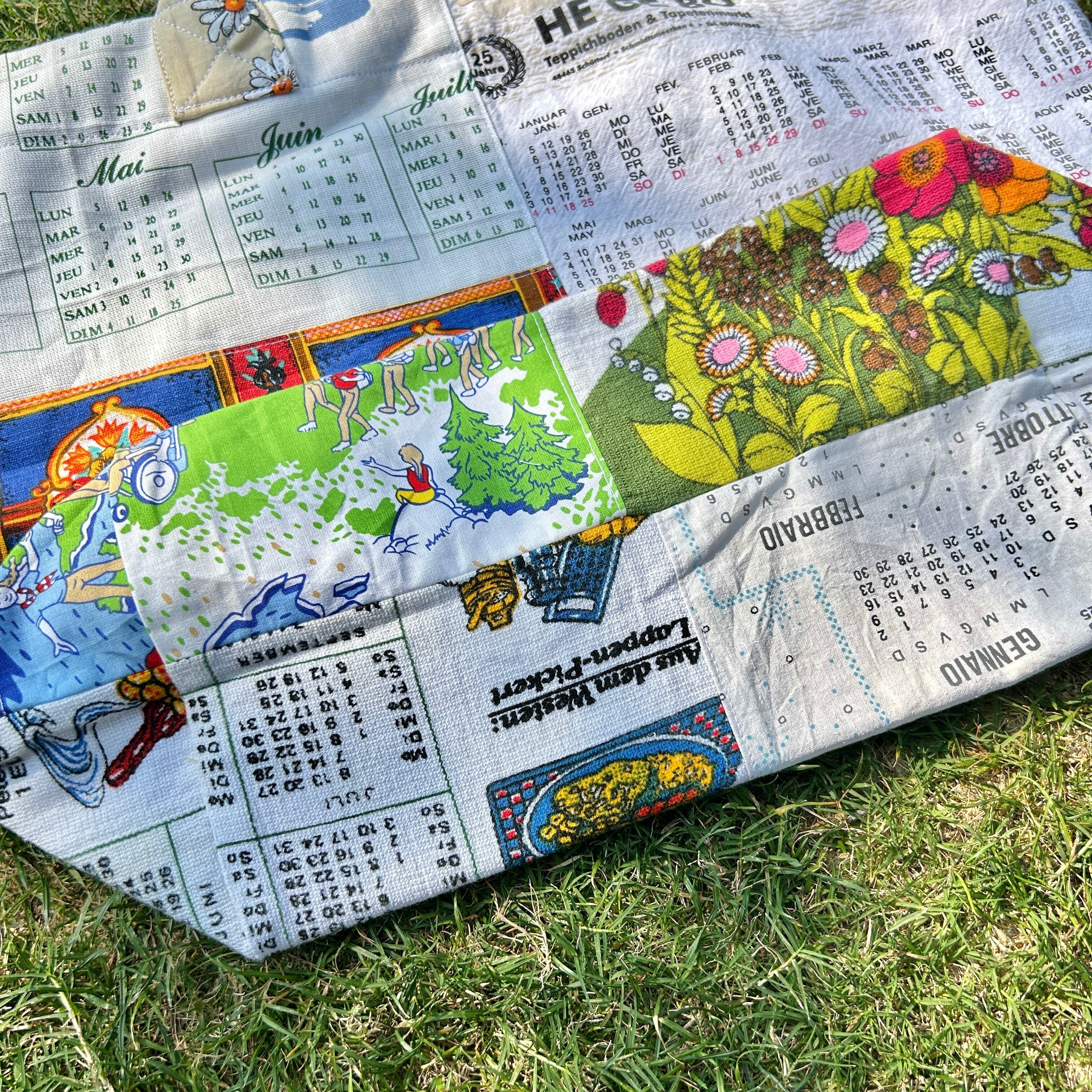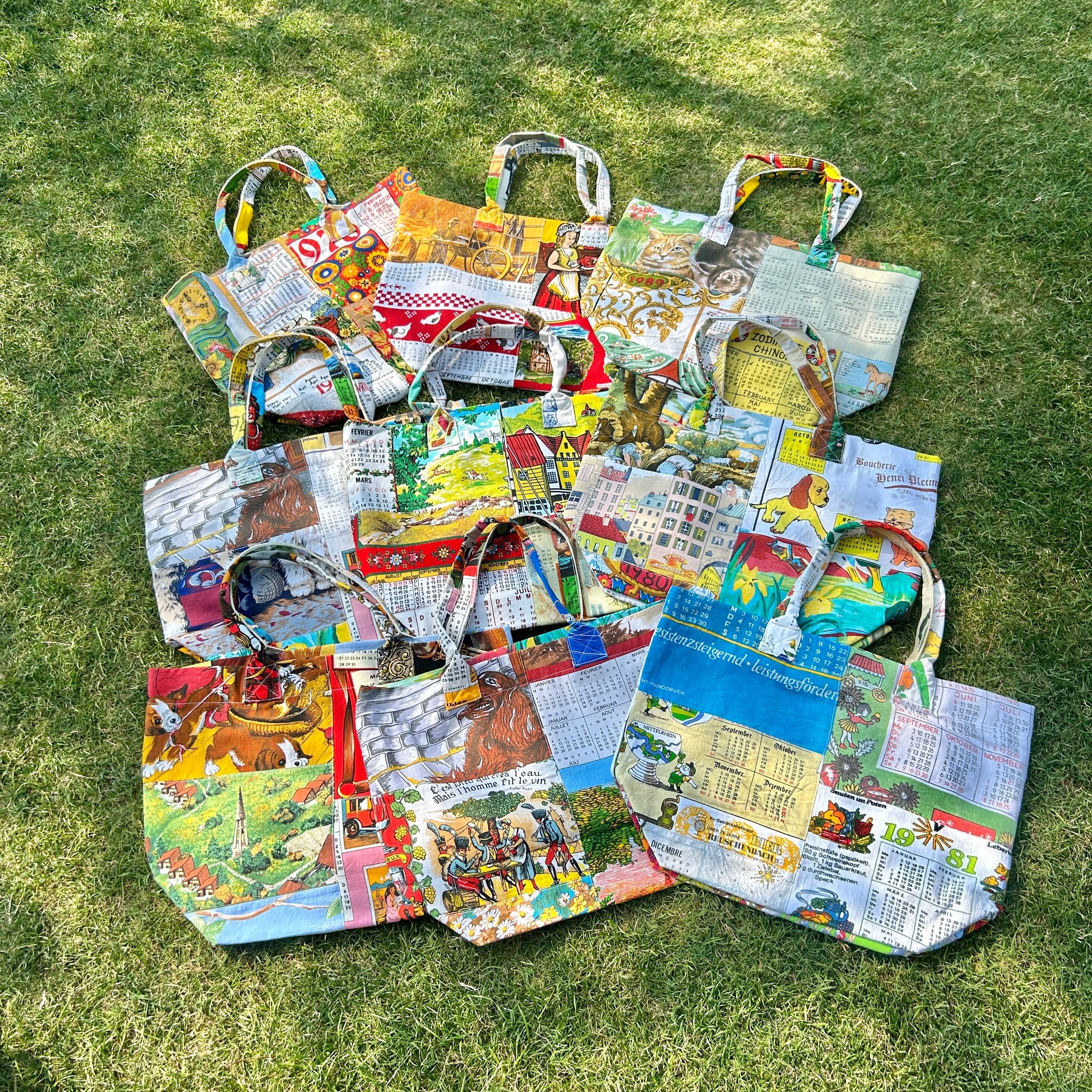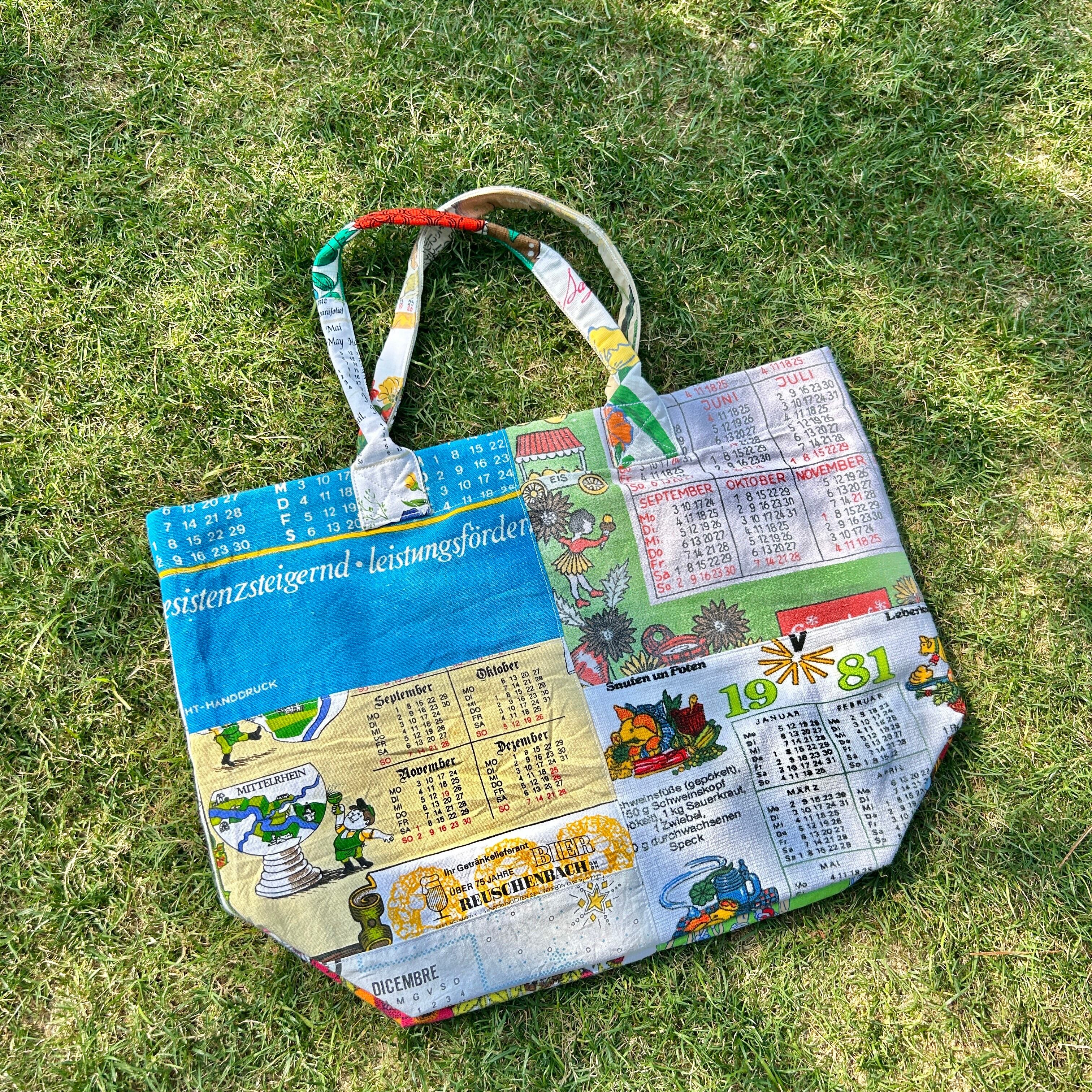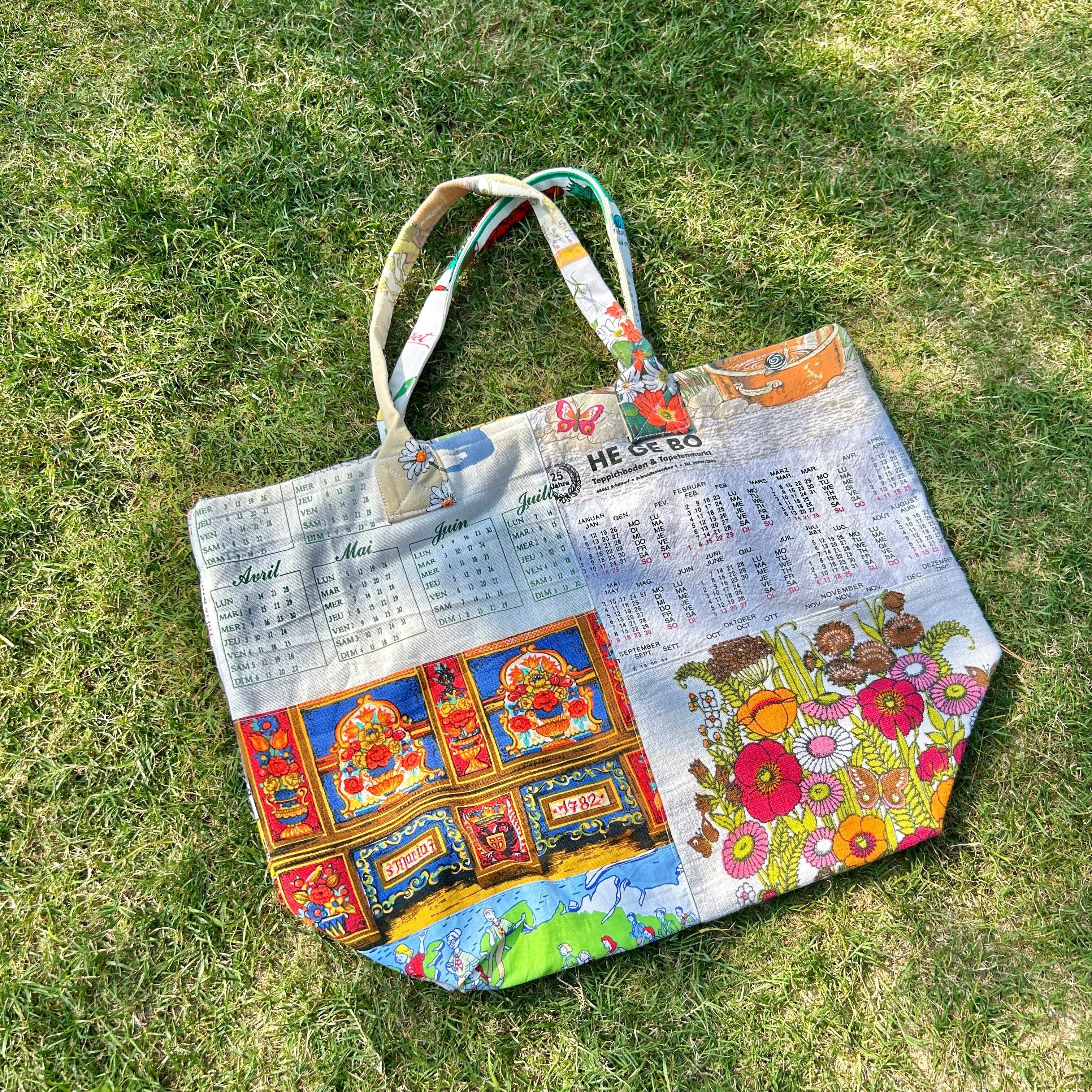 ヴィンテージのカレンダーやキッチンクロスをリメイクして作ったビッグトートバッグです。広めなマチと肩にかけれる持ち手は普段使いにぴったりです。