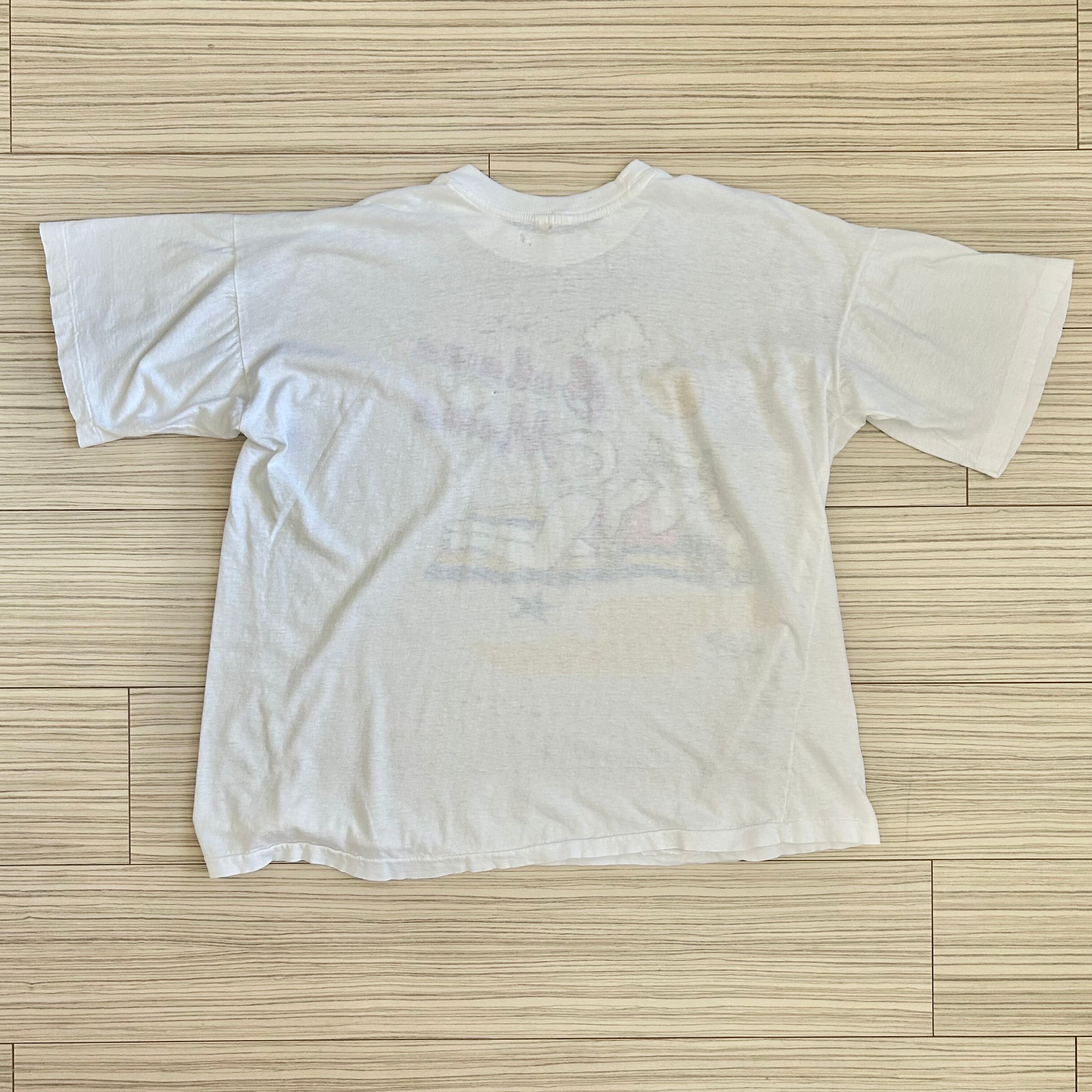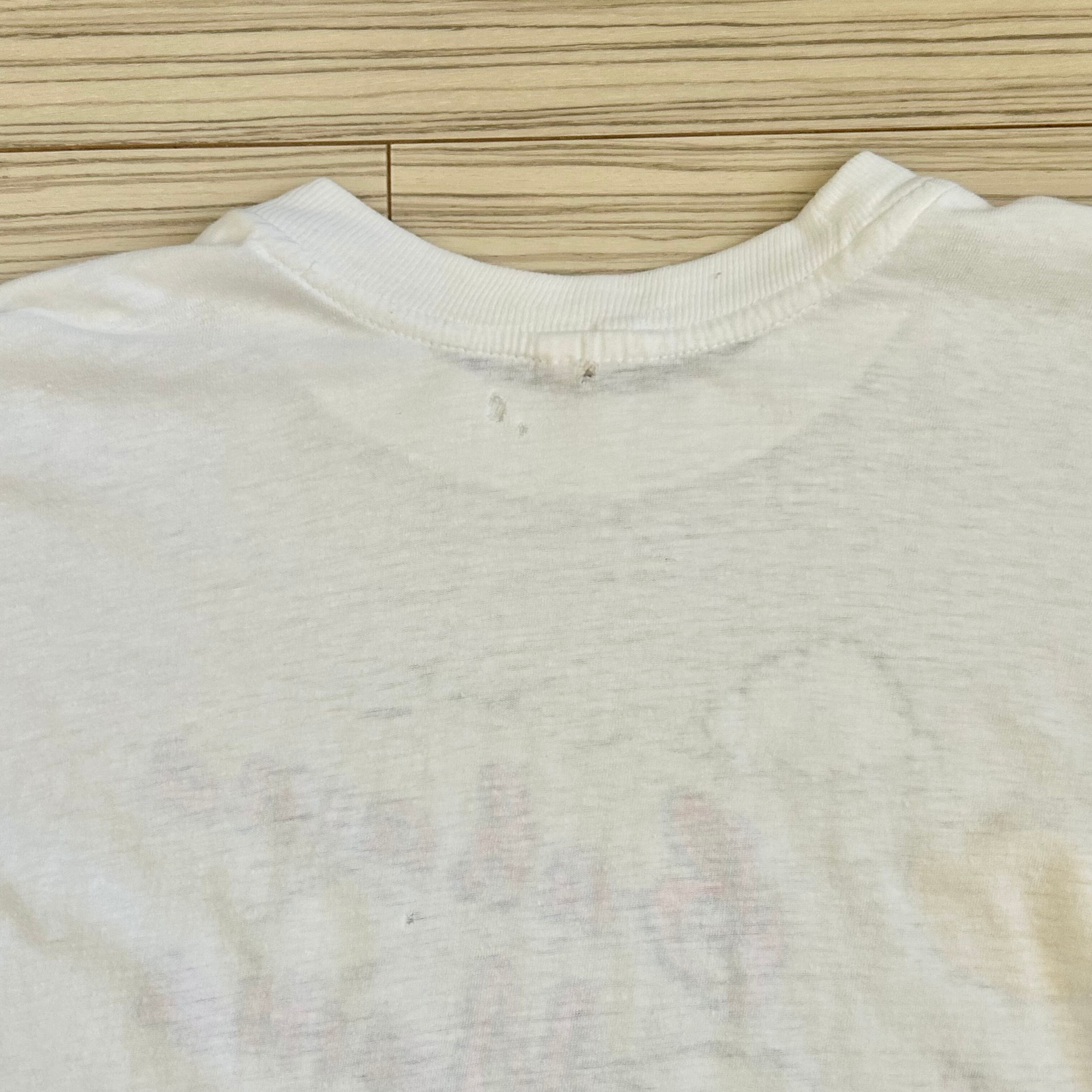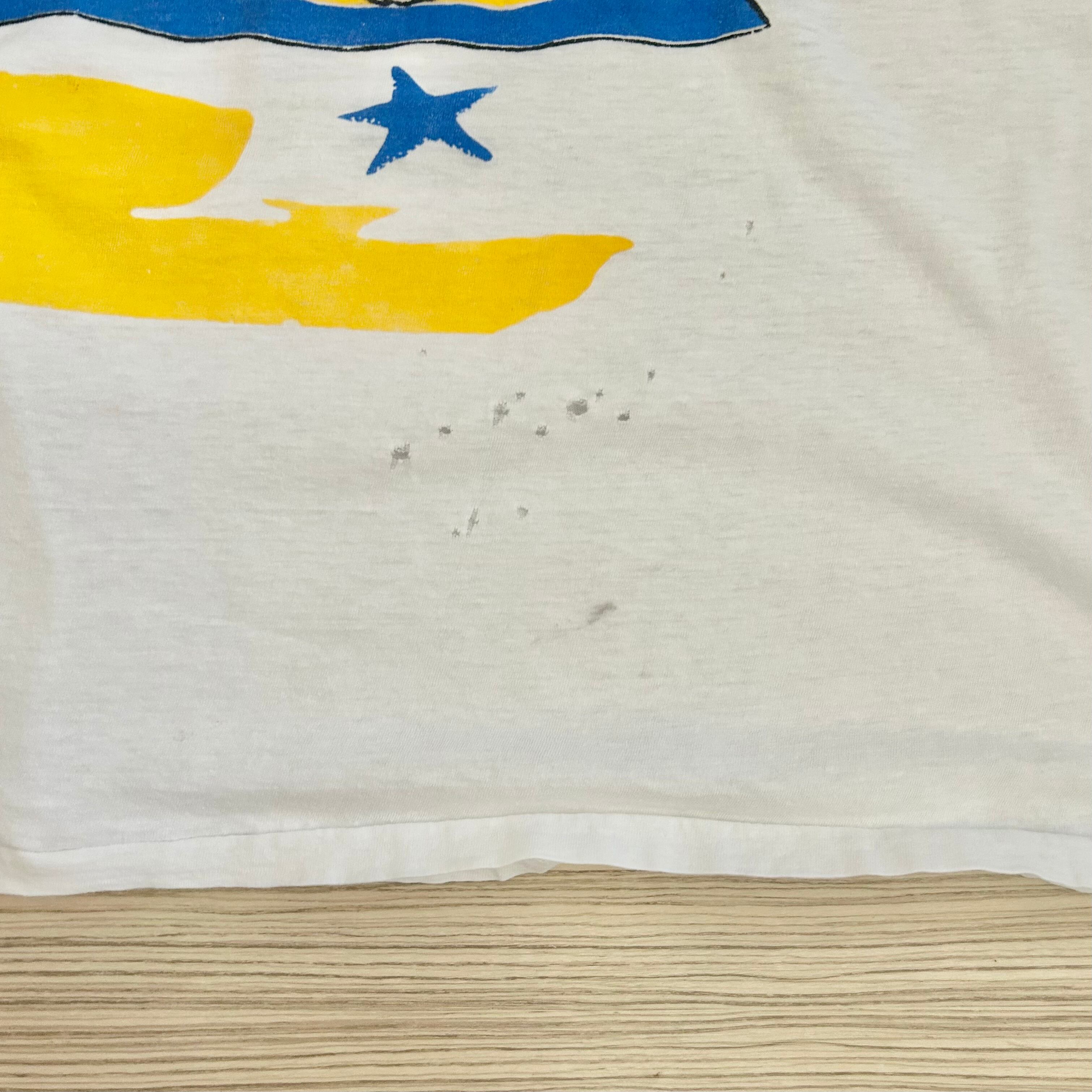 蛍光カラーが夏らしく元気なTシャツ。丈短めです。ダメージありますが渋く着て頂けると◎